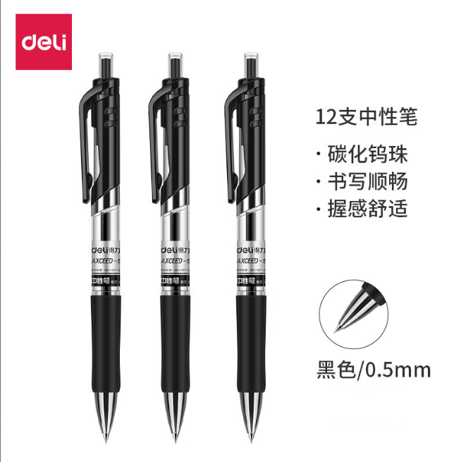 • 得力S01中性笔按动笔0.5mm子弹头学生用办公用黑色红蓝文具批发1盒12支