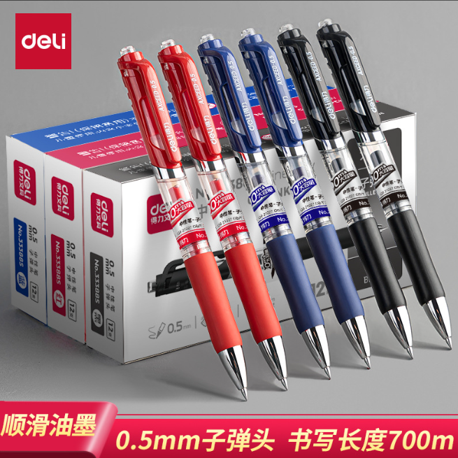 • 得力S01中性笔按动笔0.5mm子弹头学生用办公用黑色红蓝文具批发1盒12支